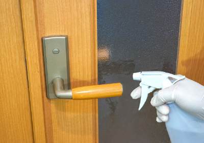 ドアノブやトイレなど手にウイルスが付着するリスクのある場所を、定期的に次亜塩素酸ナトリウムにて消毒しています。